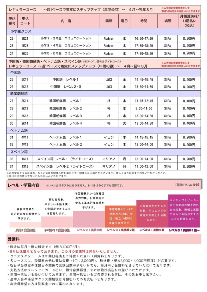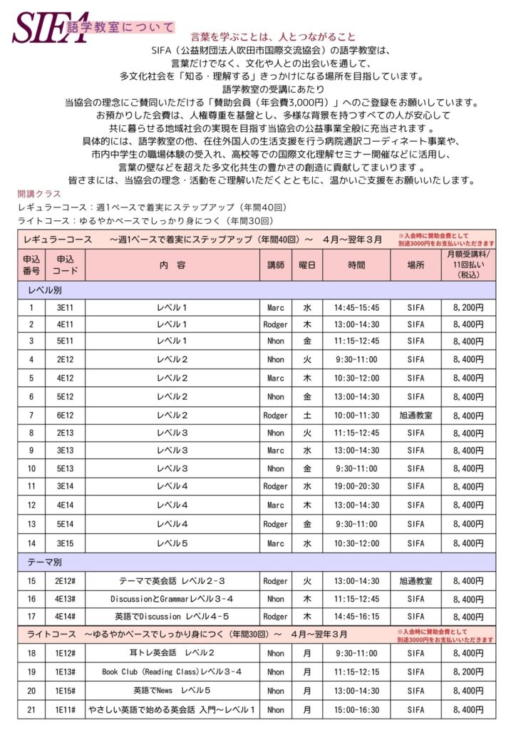 2026年度 SIFA語学教室の申込み受付